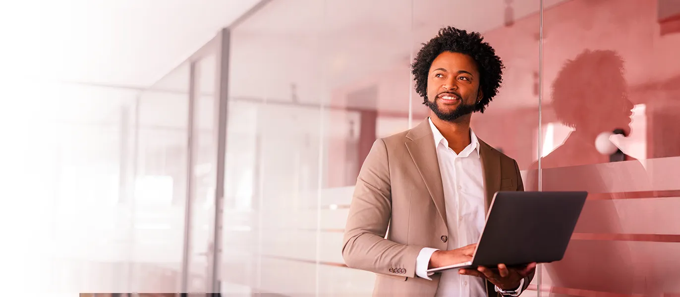 Profissional sorridente com tablet em ambiente corporativo.